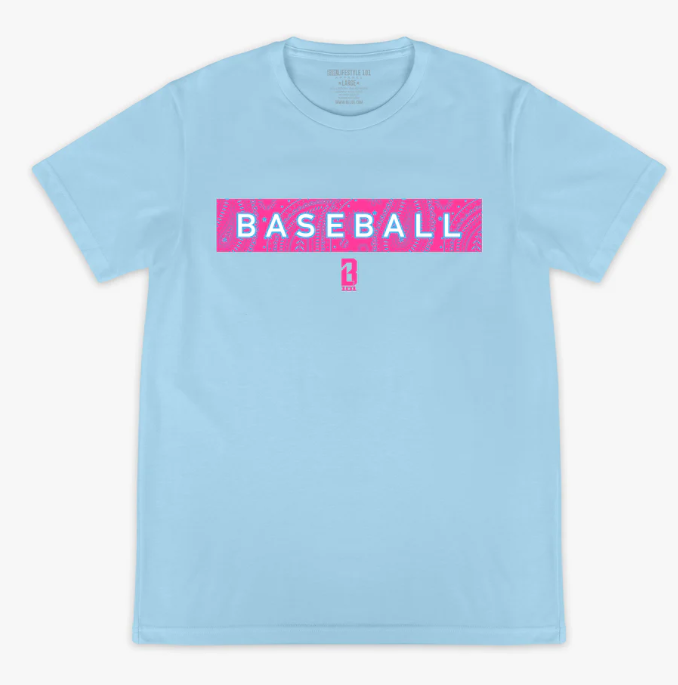 Elevate your style game with this unique twist on a classic tee. Crafted with a cotton candy blue background, the iconic word "baseball" boldly stands out across the chest against a perfectly contrasting cotton candy pink blended paisley print with athletic flair.
